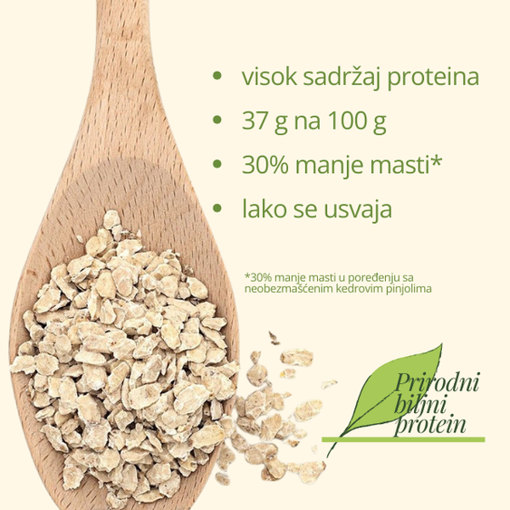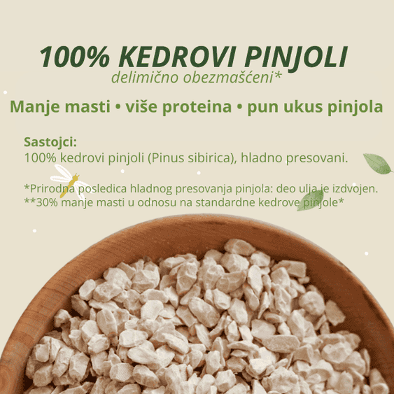 Ovo nije “nešto novo” — to su i dalje 100% kedrovi pinjoli, samo u praktičnoj formi listića, dobijeni nakon hladnog presovanja, kada se deo prirodnog ulja izdvoji. Rezultat: 30% manje masti, više proteina, a pun, svilenkast ukus pinjola ostaje.