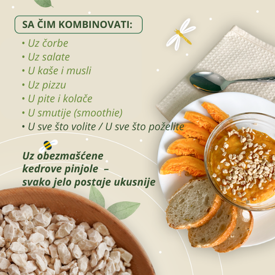 Kedrovi pinjoli delimično odmašćeni mogu se koristiti svuda i u bilo koje doba dana — kao ukusan dodatak obroku ili praktična užina.