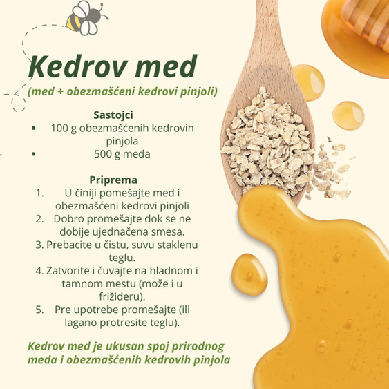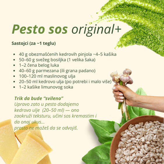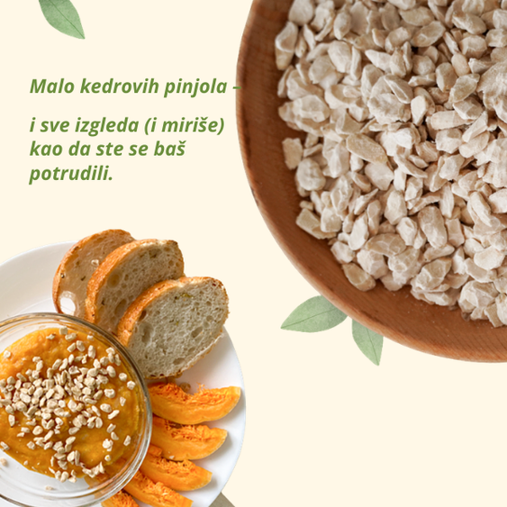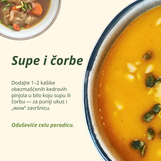 Jedna–dve kašike kedrovih pinjola – delimično obezmašćenih (hladno presovanih) lako podignu obrok: više sitosti, bolja struktura jela i onaj pun, gurmanski ukus pinjola.