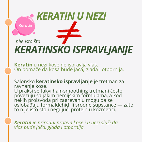 Keratin, kao prirodni protein kose, pomaže oslabljenoj vlasi da bude otpornija i zaglađenija. Važno je: ovde keratin nije “salonsko ispravljanje”, već negujući proteinski aktiv koji pomaže da kosa bude manje sklona lomljenju i grubljoj površini.