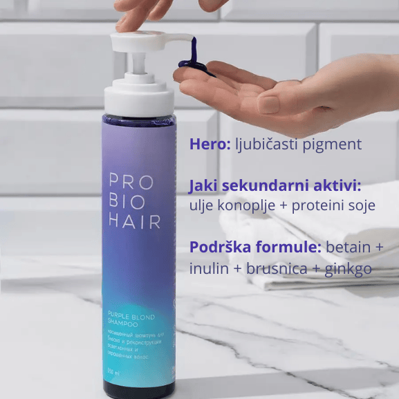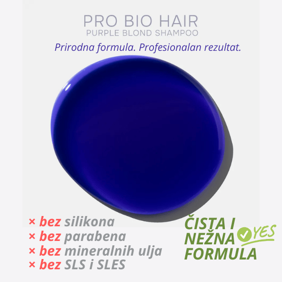 PRO BIO HAIR Purple Anti-yellow šampon osmišljen je za svetle nijanse kojima je potrebno održavanje čistoće tona bez grubog isušivanja dužine. Ljubičasti pigment pomaže u neutralizaciji neželjenih žutih tonova, tako da kosa nakon pranja ostaje svežija, urednija i sa lepšim, hladnijim odsjajem.