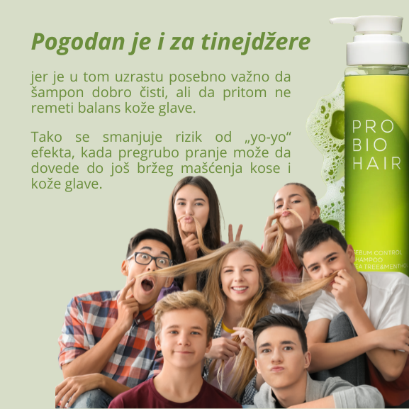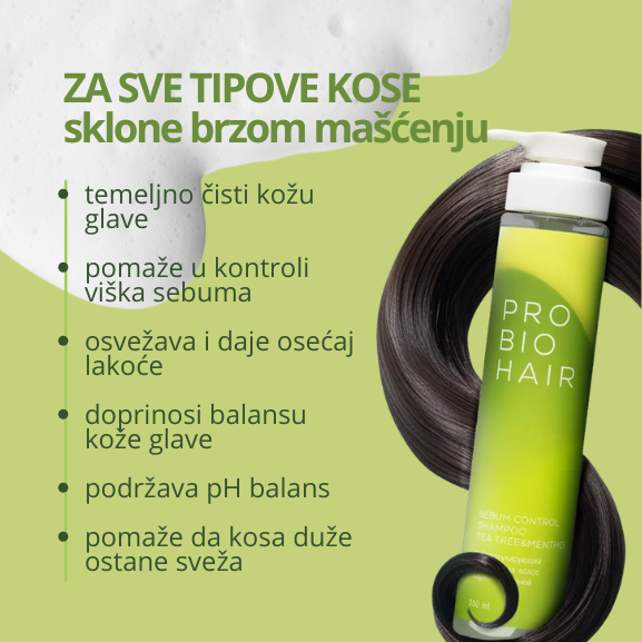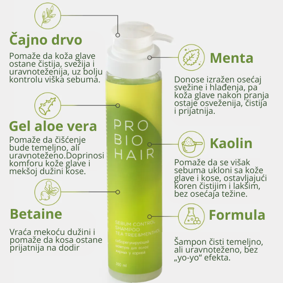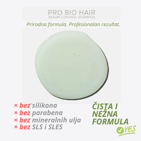 PRO BIO HAIR šampon za kontrolu viška sebuma osmišljen je upravo da prekine taj začarani krug. Njegova formula čisti temeljno, ali uravnoteženo — uklanja višak sebuma i nečistoće, osvežava kožu glave i vraća osećaj čistoće, a da pritom ne ulazi u grubo odmašćivanje koje remeti prirodan balans.