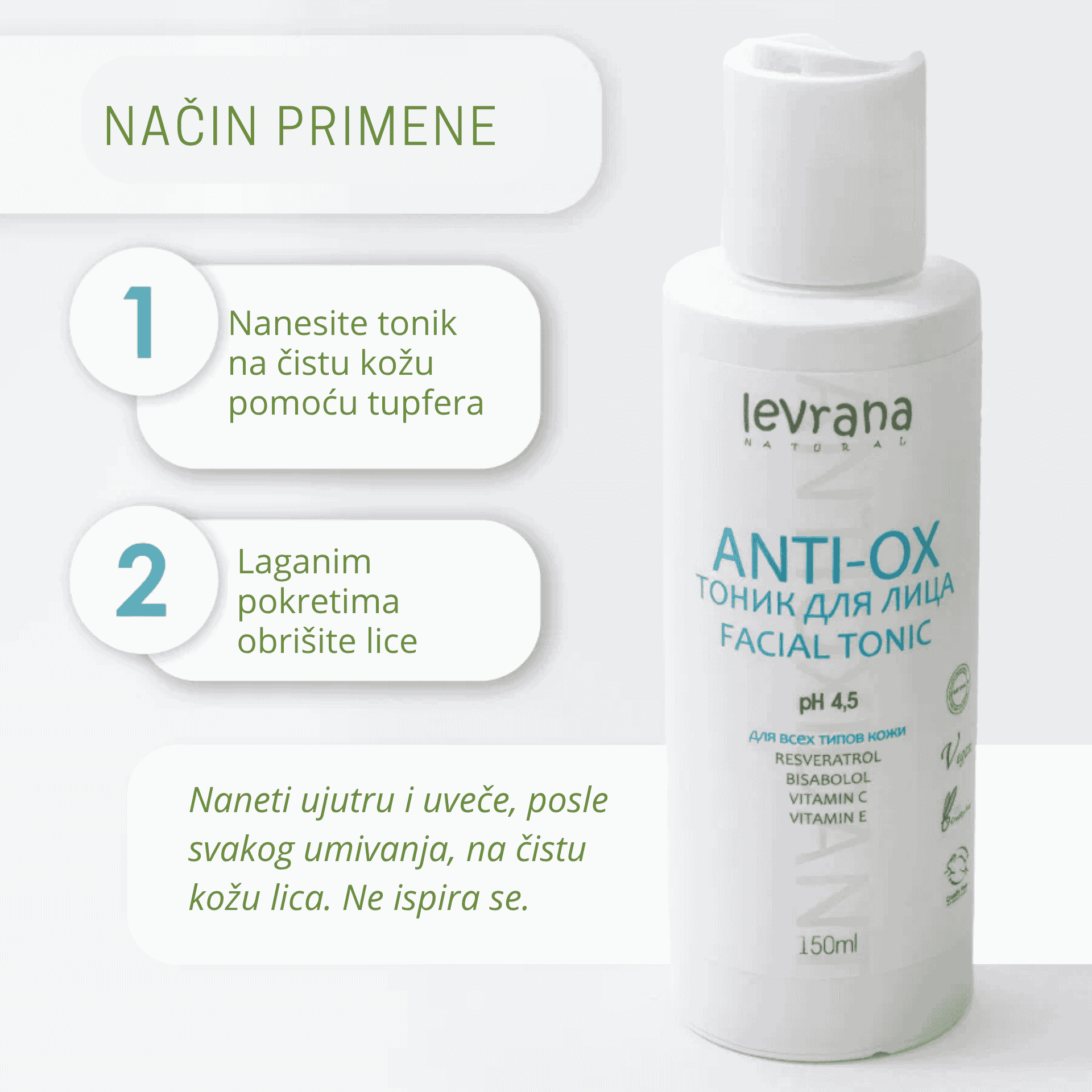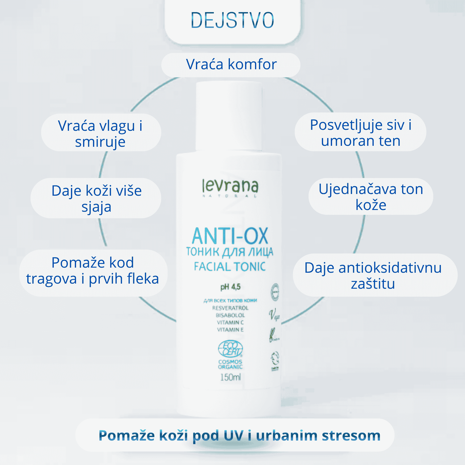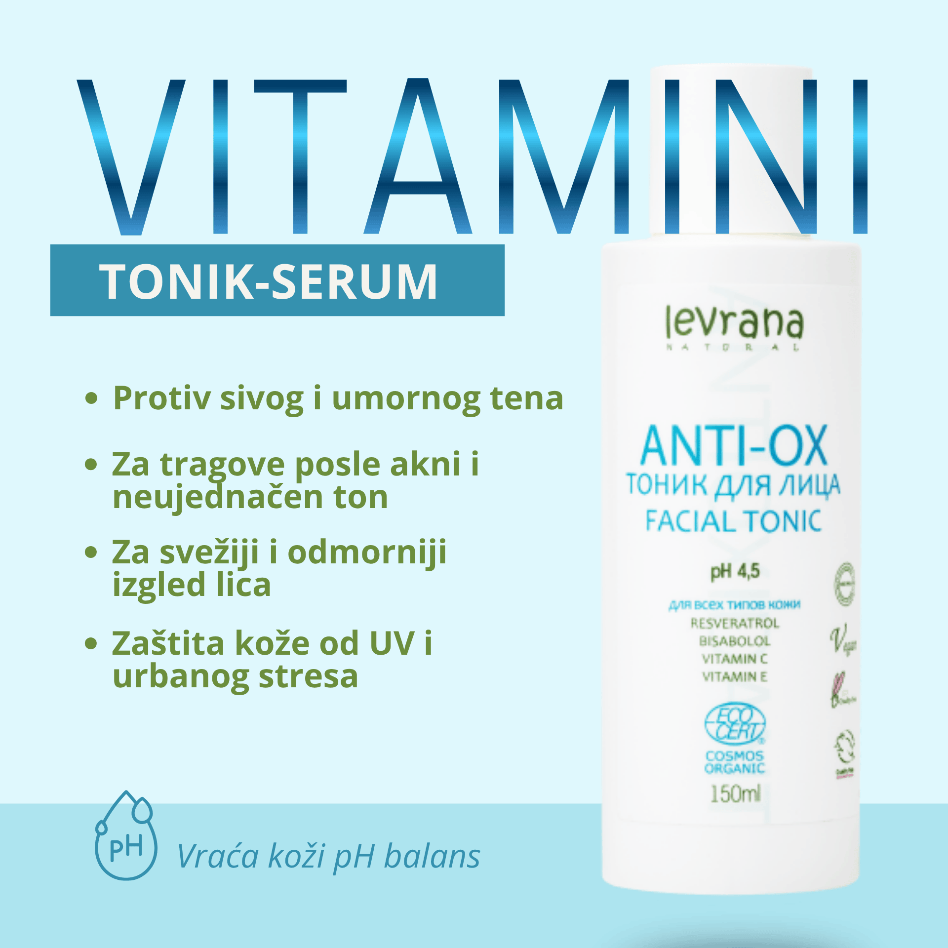 Ovo NIJE običan tonik za kratko osveženje, već Anti-OX tonik-serum za lice koji pomaže da siv, umoran i neujednačen ten izgleda svežije, življe i urednije. Formula sa fotostabilnim vitaminom C, zelenim čajem i resveratrolom posebno prija koži bez sjaja, koži sa tragovima posle akni, prvim flekama i prvim znacima starenja, kada licu treba više svetline, ujednačenosti i antioksidativne podrške.