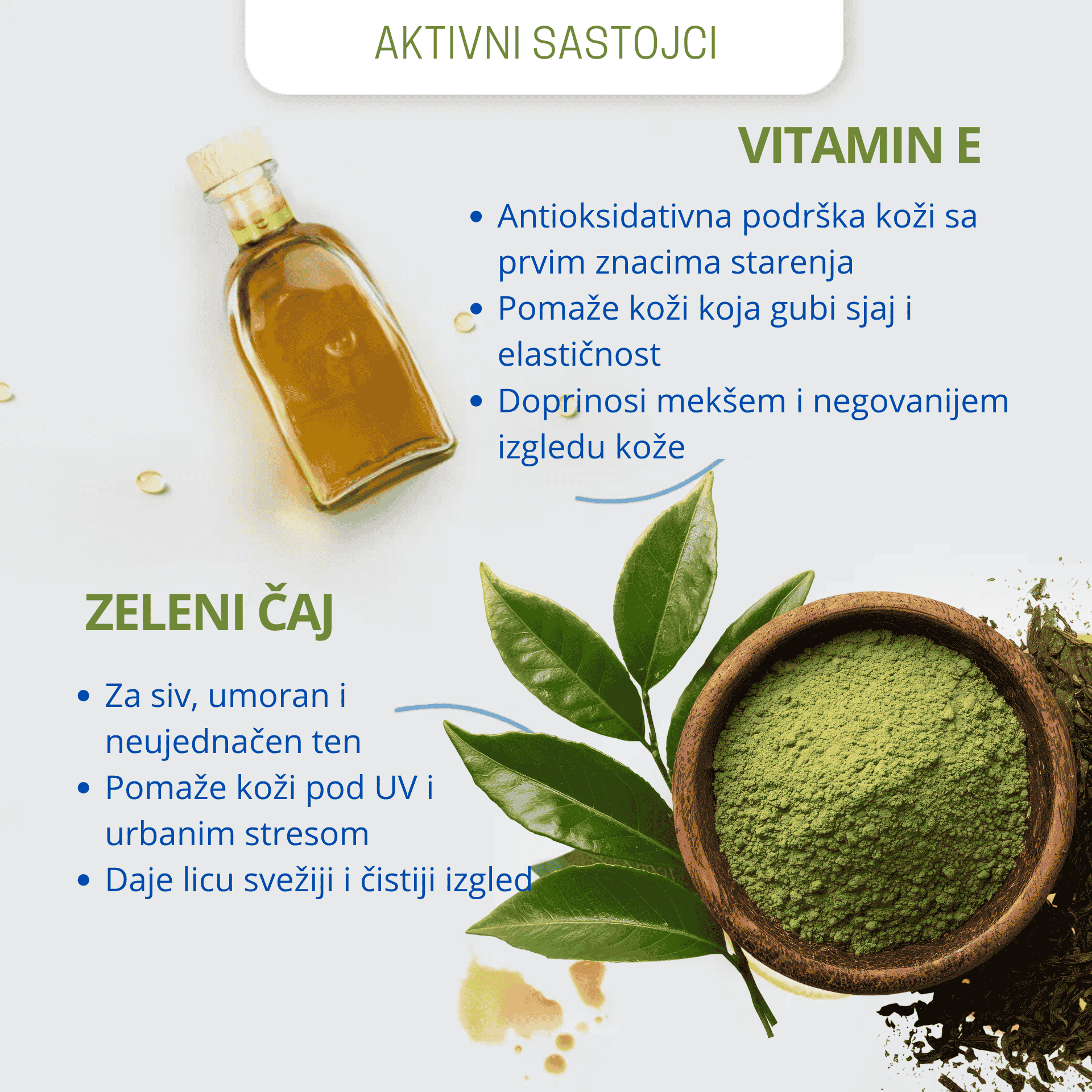 Zeleni čaj, resveratrol, vitamin C i vitamin E pomažu koži koja svakodnevno trpi sunce, grad, stres i oksidativna oštećenja.