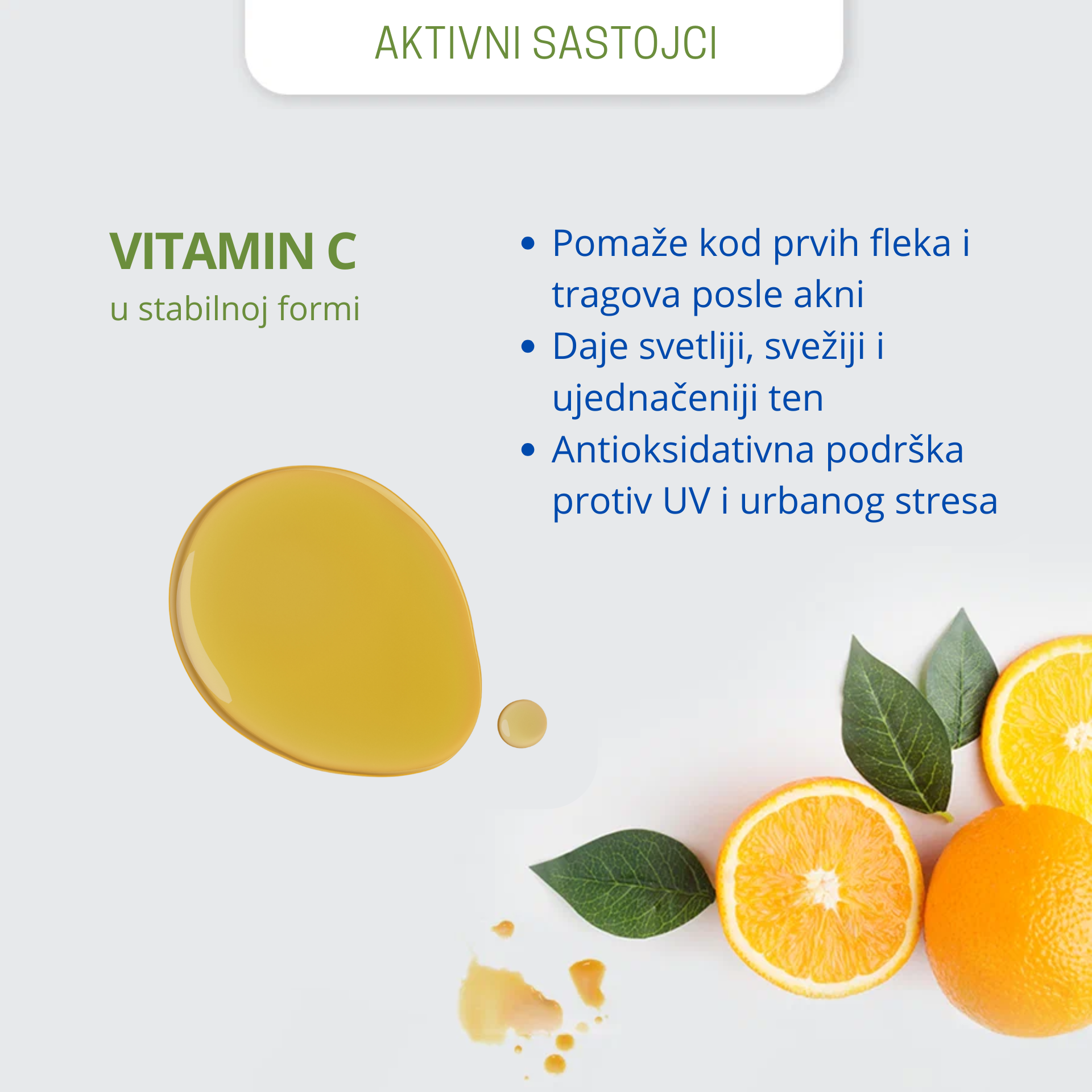 antioksidativna zaštita + svežiji ten + življa koža + manje sivila i umora na licu + tragovi posle akni + prve pigmentne promene + podrška protiv prvih znakova starenja